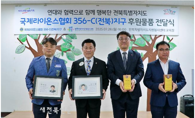 (사)전북특별자치도자원봉사센터(이사장 고영호)와 국제라이온스협회 356-C(전북)지구(총재 박성춘)는 최근 전북자원봉사센터에서 아동용 슬리퍼 3,000개 등 후원 물품을 전달했다. 이번 물품은 전라라이온스클럽(회장 송영석)이 준비해 뜻깊은 나눔의 의미에 동참했다. |